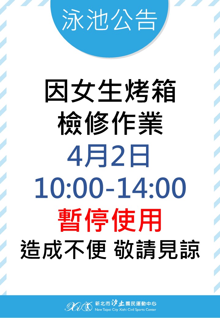 游泳館女生烤箱因檢修作業,將於4月2日(四)10:00至14:00暫停使用,造成不便敬請見諒。
